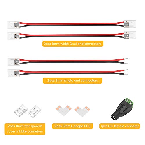Producten Inbegrepen 2 stks 8mm breedte Dual end connector, 2 stks 8mm single end connectoren, 2 stks 8mm L vorm PCB, 2 stks transparante cover middelste connetors, 1 stks DC vrouwelijke connetor.