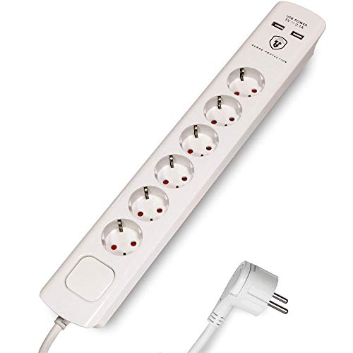 Deze stekkerdoos heeft 6 stopcontacten die 45 ° gedraaid zijn. Zo passen ook hoekstekkers naast elkaar. Alle stopcontacten hebben een kinderslot. De schakelaar brandt discreet wanneer hij is ingeschakeld. Via de schakelaar kunnen alle stopcontacten en de geïntegreerde USB-oplader tegelijkertijd worden uitgeschakeld. Aan de onderkant bevinden zich twee uitschuifbare lussen waarmee de lijst aan de muur, vloer of tafel kan worden bevestigd. Tegelijkertijd dienen deze lussen voor het opbergen van de kabel. Met de ingebouwde USB-snellader kun je snel en veilig 2 apparaten opladen. De lader heeft een chip die detecteert welke mogelijkheden een snel opladen een aangesloten apparaat heeft. De uitgangsstroom wordt dienovereenkomstig aangepast. Hoe hoger de uitgangsstroom is, hoe sneller het apparaat is opgeladen. USB-aansluitingen op de pc en eenvoudige laadadapters geven normaal 0,5 A af. Deze adapter kan tot 2, 1 A aan één uitgang leveren, dus ongeveer vier keer zo snel opladen. De chip identificeert de apparaten volgens de normen USB BC1.2 (USB Battery Charging), Apple Charging, Samsung Galaxy. Bijna alle huidige smartphones en tablets zijn daarbij compatibel. Als uw apparaat geen van deze normen ondersteunt, wordt het in normale snelheid opgeladen. De maximale laadstroom voor beide uitgangen bedraagt 2,1 A. Dus als er 2 apparaten tegelijk worden opgeladen, is er voor elk ongeveer 1 A beschikbaar. Zodra een batterij volledig is opgeladen, wordt het opladen beëindigd. Deze stekkerdoos is door een onafhankelijk instituut met succes getest en voldoet aan alle Duitse en Europese veiligheidsnormen. De geïntegreerde overspanningsbeveiliging beschermt je aangesloten apparaten. Overspanningsbeveiliging (Surge Protective Device) SPD type 3, Uc 250 V~, L-N: Uoc : 4 kV, up: 2 kV, L/N-PE: Uoc: 4 kV, up: 2 kV. Lengte van de aansluitkabel 1,5 m, aansluiting max. 3680 W/230 V.
