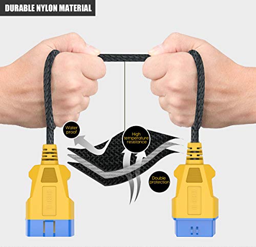 HOGE KWALITEIT: De obdii-verlengkabel maakt gebruik van hoogwaardige pure koperen kern en kunststof met TPE-materialen. Er zijn 8 inspectiestappen nodig, van spuitgieten tot spuitgieten, om ervoor te zorgen dat de kabel meer dan 10.000 keer kan worden aangesloten.