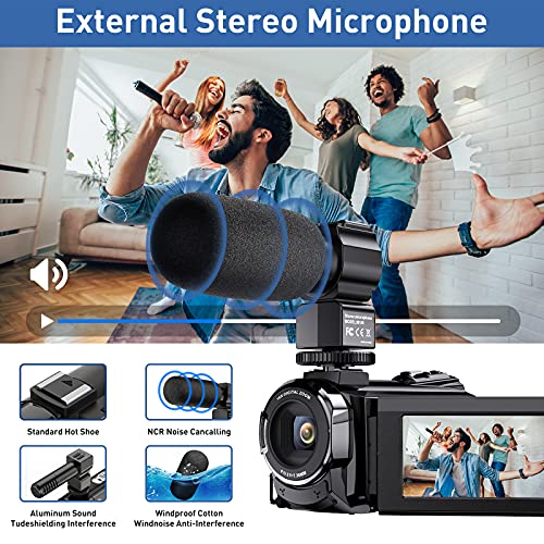 ★ Camcorder met houder & lenskap: deze vlog camera wordt geleverd met een lenskap, camerabouder, externe microfoon en afstandsbediening. De lenskap filtert overtollig verdwaald licht uit, voorkomt flare veroorzaakt door buitenlicht en beschermt tegen onverwachte stoten of schokken. De opvouwbare handheld stabilisator houdt de 4k camera stabiel tijdens het opnemen, Ideaal voor het maken van bewegende lage hoek video’s en beelden.Ingebouwde microfoon en externe microfoon maken van trouw audio reproduceren.