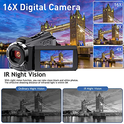 4K Video Camera Camcorder Ultra HD 48MP WiFi IR Nachtzicht Vlogging Camera voor 3 “IPS Touchscreen 16X Digitale Zoom YouTube Camera Recorder met Microfoon, Handheld Stabilizer, Lens Hood