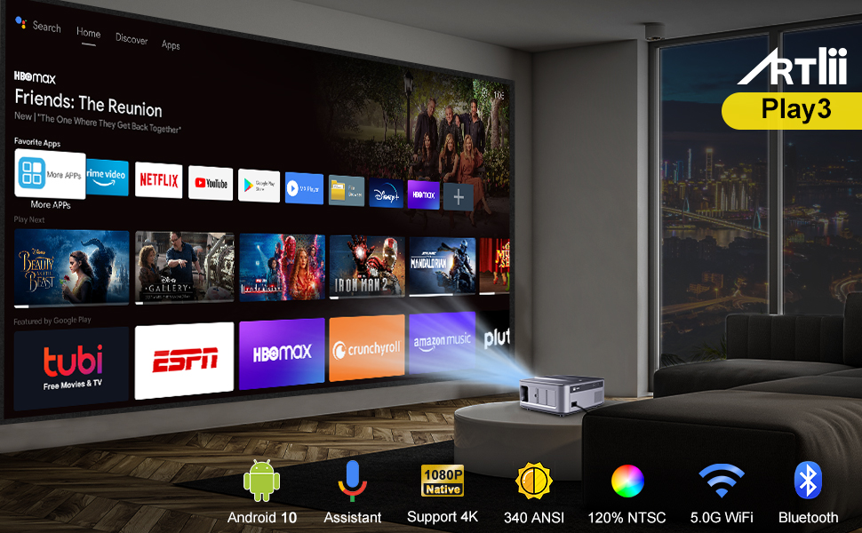 【Native 1080P, UHD ondersteunt 4K】Artlii Play3 Smart Android Beamer is de nieuwste WiFi video projector in 2021. Het neemt de originele fysieke resolutie van 1920×1080 pixels aan, ondersteunt 4K, ultrahoge helderheid tot 340ANSI en 5 lagen hoogbrekend glas NTSC is zo hoog als 120%, veel beter dan vergelijkbare producten, en het beeld is helderder en scherper.