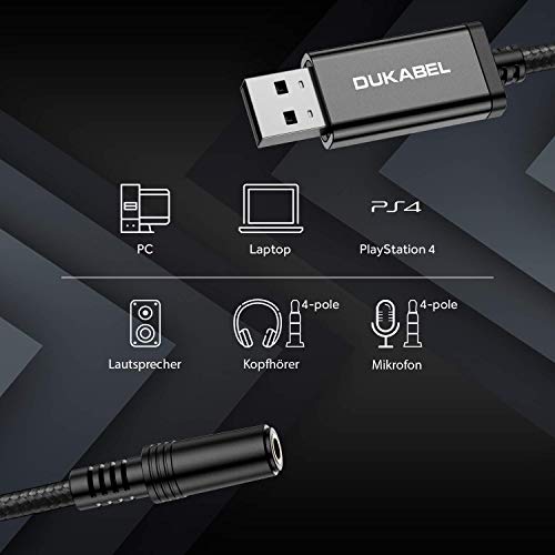 DuKabel USB externe geluidskaart (USB naar 3,5 mm verlengkabel) – breidt de mogelijkheden voor je USB-apparaten uit – kan je defecte geluidskaart of audio-aansluiting vervangen. – Laat je PS4 met externe luidsprekers verbinden om de geluidseffecten te verbeteren, zodat je kunt spelen zoals in het slagveld. – Daardoor wordt je oude computer of notebook met aparte audio- en microfoonaansluiting een 4-polige aansluiting toegevoegd om een 4-polige microfoon of 4-polige headset voor online chat aan te sluiten. Compatibiliteit: 1. USB-stekker voor afspeelapparaat met USB-poort (bijv. pc, laptop, desktop, notebook, PS4 enzovoort) 2. 3,5 mm Aux-poort (vrouwelijk, 4-polig) voor 4-polige hoofdtelefoon, 4-polige TRRS-microfoon of luidspreker: – Gaming headset met slechts een 3,5 mm jack zoals Logitech G231. – 3,5 mm smartphone oordopjes (4 pole CTIA standaard) zoals Samsung, Huawei, Xiaomi, LG, Blackberry, HTC, Sony. (Niet compatibel met iOS standaard oordopjes). – 4 pole RRRS-microfoon zoals Rode SmartLav+ enzovoort. Opmerking: 1. Unidirectionele audio-overdracht: alleen van USB naar 3.5, niet van 3.5 naar USB. 2. Geschikt voor hoofdtelefoon met 3,5 mm TRRS-aansluiting (behalve Beats, Bose en andere hoofdtelefoon voor iOS smartphone). Het werkt niet met hoofdtelefoons met twee 3,5 mm stekkers (één voor audio-uitgang, één voor microfooningang). 3. Ondersteunt slechts 4-polige TRRS-microfoon (niet geschikt voor TS of TRS-microfoon). 4. Kan niet worden gebruikt met Xbox One, Playstation 3. Omvang levering: 1 * DuKabel Headset USB Adapter (USB naar 3,5 mm Aux Audio Converter)