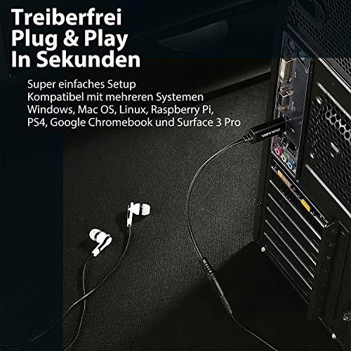 DuKabel externe USB Audio Converter zet een USB-interface naar vrouwelijke 4-pins TRRS 3,5 mm jack aansluiting. Eenvoudige installatie via USB – geen extra drivers nodig. Compatibel met Windows 10/8.1/8/7/Vista/XP, Mac OS X, PS4, Linux, Windows Surface 3 pro, Raspberry Pi enz.